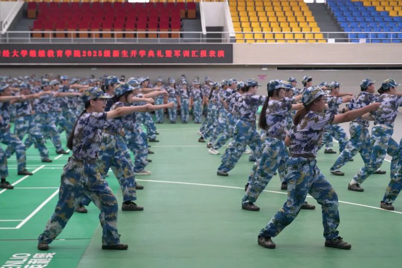 随后,军训汇报表演正式开始。在热烈的氛围中,参训新生依次进行分列式、军体拳、旗语操等科目展示。步伐整齐、口号响亮、动作协调,展现了为期一周军事训练的训练成果,体现了2025级新生良好的组织纪律性和团队协作意识,赢得现场师生的肯定与掌声。