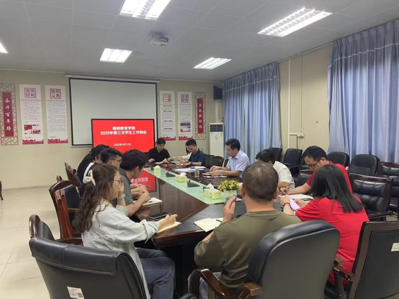 9月12日上午,继续教育学院在善学楼7楼会议室召开2025年第三次学生工作例会。学院党总支书记张政彪、副书记杨勇、自学考试中心钟雪芬老师、各项目部学工负责人及全体辅导员参加会议。会议由杨勇主持。