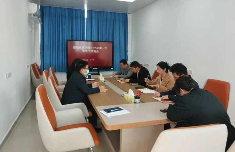 1月7日上午,继续教育学院在善学楼604会议室召开2025年第1次学生工作例会。学院党总支书记蔡楷有、副书记杨勇、自学考试中心主任纪雪萍、钟雪芬老师、各项目部负责人以及全体辅导员出席会议,会议由纪雪萍主持。