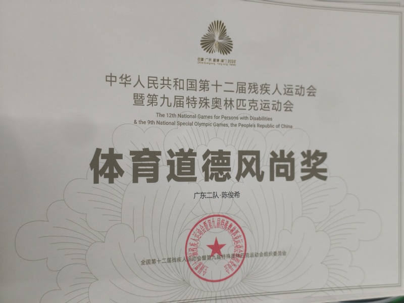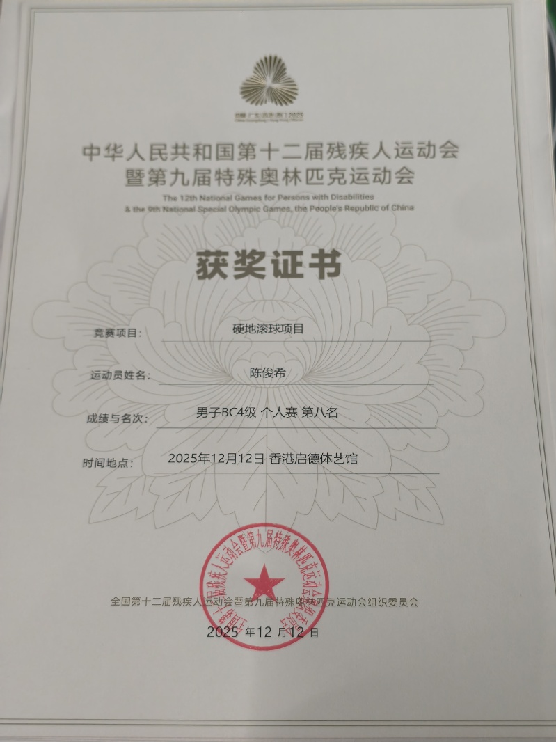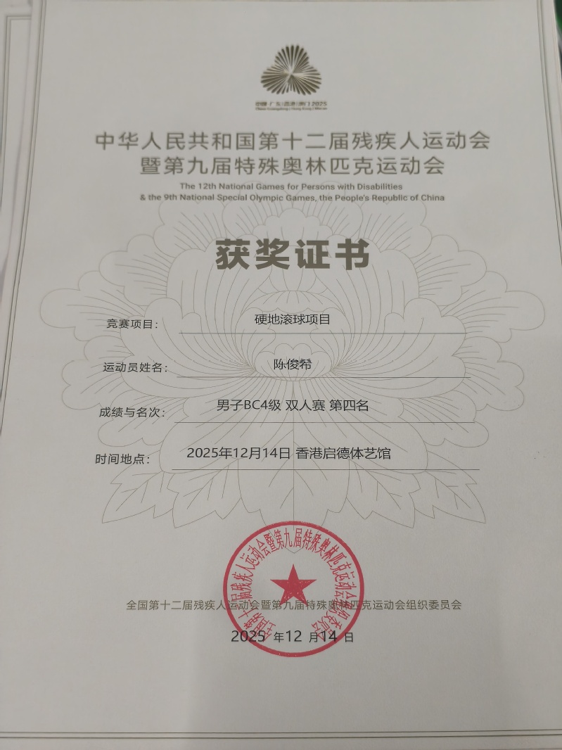 本届赛事于12月6日至15日在香港启德体艺馆举行,是国内水平最高、影响最广的综合性残疾人体育盛会。硬地滚球是一项需要极高技巧、策略与心理素质的运动,面对来自全国的顶尖选手,陈俊希沉着冷静,稳定发挥,在赛场上展现了非凡的毅力与卓越的竞技水平。双人赛中,他与队友默契配合,一路过关斩将;个人赛中,他独立应对挑战,每一掷都凝聚着平日刻苦训练的汗水与坚韧不拔的意志。