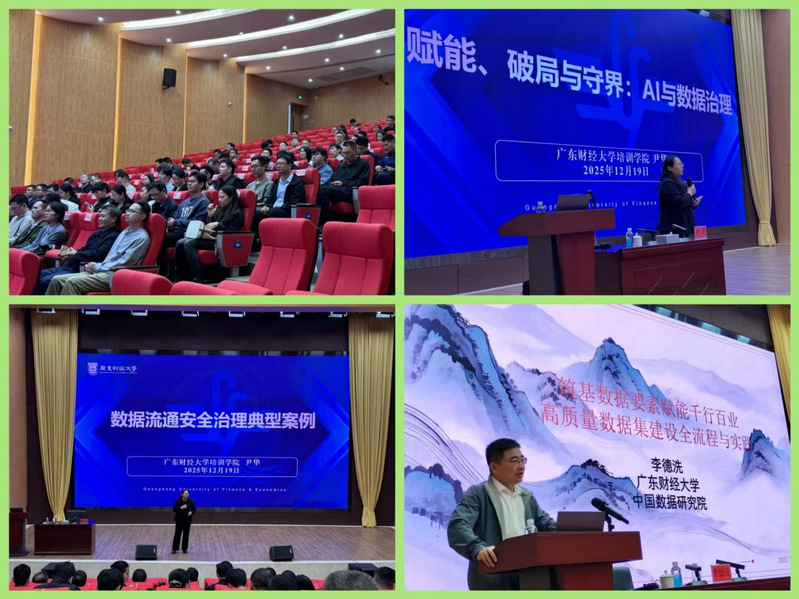 为深入贯彻落实国家关于数字化转型与数据安全保障的决策部署,提升区域数据治理与安全合规整体水平,推动数字经济高质量发展,广东财经大学全民数字素养与技能培训基地联合惠阳区政务服务和数据管理局、惠阳区开放大学、“双百行动”驻惠阳区服务队,于2025年12月19日在惠阳区委党校共同举办“数据治理与安全合规”专题讲座交流活动。本次活动由惠阳区开放大学校长邓欣主持,广东财经大学继续教育学院党总支书记张政彪、培训学院副院长尹华、中国数据研究院院长李德洗、“双百行动”驻惠阳区服务队队长周瑾、副队长梁吉平,惠阳开放大学领导班子成员,惠阳区政数局副局长梁永峰等领导出席。全区44家单位近百人参与交流。