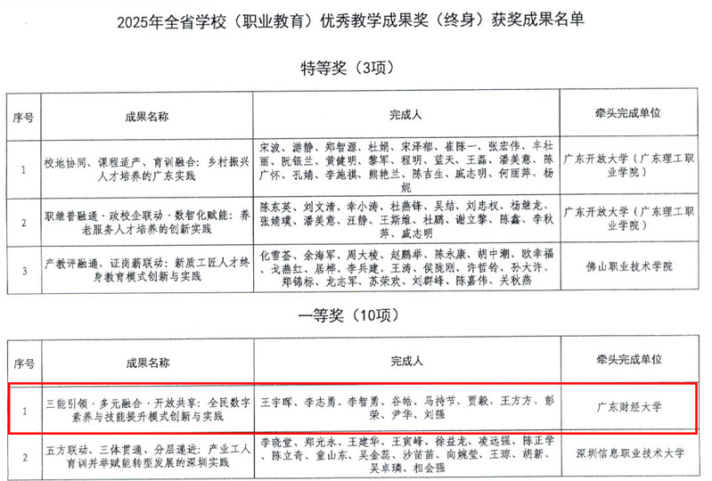 近日,2025年广东省教育教学成果奖评选结果正式揭晓。由我院牵头实施的教学成果《三能引领・多元融合・开放共享:全民数字素养与技能提升模式创新与实践》荣获职业教育类一等奖。这是我校首次申报职业教育类教学成果,并首次即斩获一等奖,实现该奖项类别上的历史性突破。这不仅是对学院长期深耕全民数字素养与技能提升工作的高度肯定,更标志着学校在职业教育与终身教育领域的改革探索与实践成效,获得省级权威高度认可。