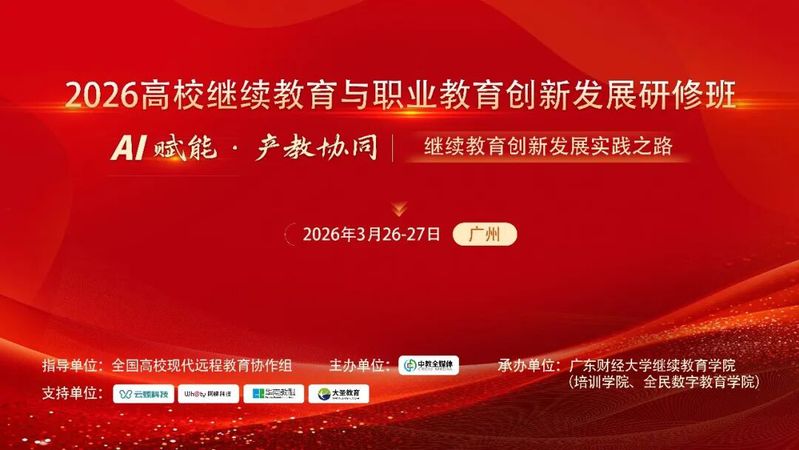 3月26日至27日,由全国高校现代远程教育协作组指导、中教全媒体主办、广东财经大学继续教育学院(培训学院、全民数字教育学院)承办的“2026高校继续教育与职业教育院长会议暨AI赋能·产教协同创新发展研修班”在广州举行,此次会议以“AI赋能·产教协同”为主题,吸引了来自北京师范大学、西安交通大学、中山大学、哈尔滨工程大学、东北财经大学等全国65所高校的百余位院长及同仁参加,共绘继续教育高质量发展新蓝图。