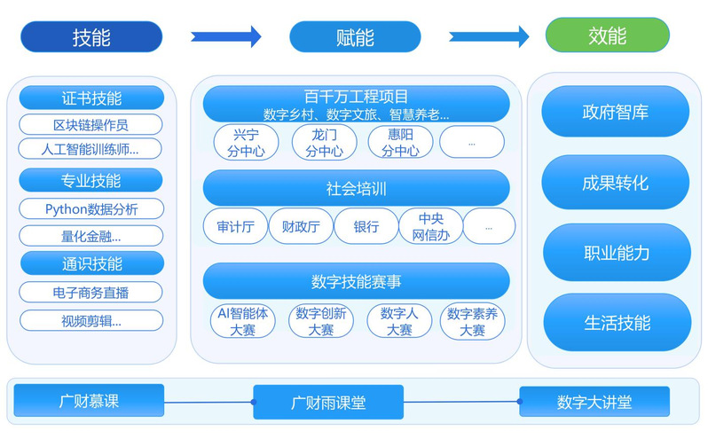 一是从学会技能到创造价值,打通完整能力培育链条。以技能、赋能、效能为引领,构建链式能力培养路径(图1)。以“技能”引领数字技术提升,面向全民多样化需求,设计通识技能、专业技能和证书技能三类课程,帮助群体跨越数字鸿沟、夯实数字基础、助力数字创新;以“赋能”引领数字应用,依托“数字+、AI+”等实现技术赋能,结合“百千万工程”、乡村振兴、湾区经济发展等现实场景,整合“广财慕课”“广财雨课堂”“数字大讲”等平台资源,推动数字技能在学习、就业、创业和生活中的落地应用;以“效能”引领数字创造,强化育人成效(提升综合素质与创新能力)、培训成效(持续覆盖不同群体)、实践成效(成果转化为标准、政策与案例)。通过“三能引领”,形成“技能提升—赋能应用—效能转化”的完整能力培育链条,推动社会治理效能提升与区域创新能力有效增强。