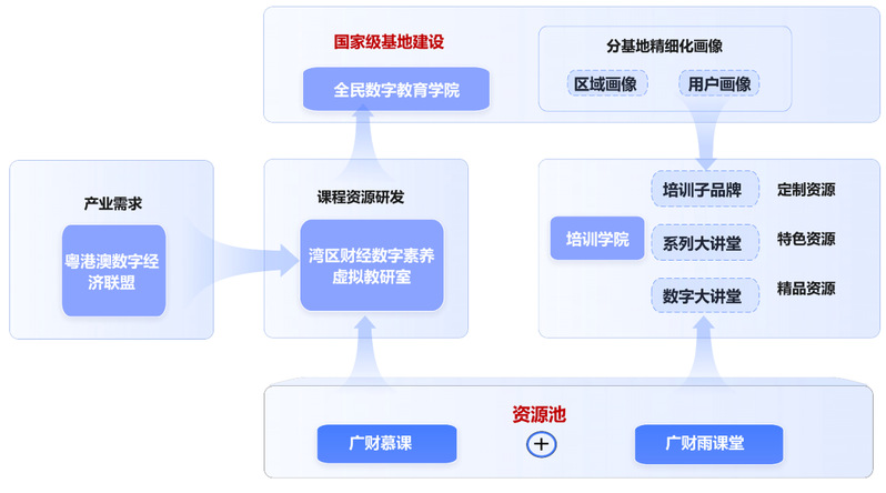 二是构建多主体协同机制,分级分类丰富培训资源。培训资源建设涉及多个组织,需要多方协同,建设模式如(图2)所示。通过打通“广财慕课”与“广财雨课堂”,实现课程资源与教学过程的有机协同,建设数字素养培训总资源池,并以此为基础打造数字大讲堂,开发外向型精品资源,推动优质课程资源的社会化应用;依托粤港澳数字经济联盟等开放平台,促进校内培训课程供给与产业发展需求精准对接,实现对区域社会需求的动态响应,通过湾区财经数字素养虚拟教研室建设,推动课程、教材、平台与师资深度融合,开展数字素养培训课程研发;通过全民数字教育学院与培训学院一体化建设机制,前者链接基地建设,建立基地区域及用户画像,后者将优质成果高效转化为各类精品化、特色化与定制化培训资源。