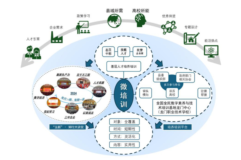 三是以场景化实践为驱动,构建多元融合提升路径。围绕地方数字经济发展、数字技能人才培养和全民数字素养提升,以“广财慕课+广财雨课堂+数字大讲堂”一体化平台为支撑,基地区域分中心建设为辐射路径,建立区域培训对象用户画像,采用“微培训”模式,打造区域培训子品牌,通过线上线下相结合方式多渠道培训,让培训成效看得见、摸得着。已建成广东兴宁、龙门、惠阳、博罗和广西贺州5个基地区域中心。以龙门分中心为例(图3),①采取每月一期、每期一讲、每讲一专题模式,打造龙门县“五新”·知行大讲堂。②围绕“环南昆山-罗浮山”引领区建设等重要任务,培育打造业务能力培训、民营企业家培训、专业技能人才培训、人工智能与政务服务培训等子品牌。③“数字大讲堂”课程对全县各部门各乡镇村免费开放,根据村民需求在线上组织集中或分散学习,并进行答疑交流。通过区域中心模式,有效解决了传统培训中培训内容与真实产业、现实生活场景脱节的实践瓶颈。